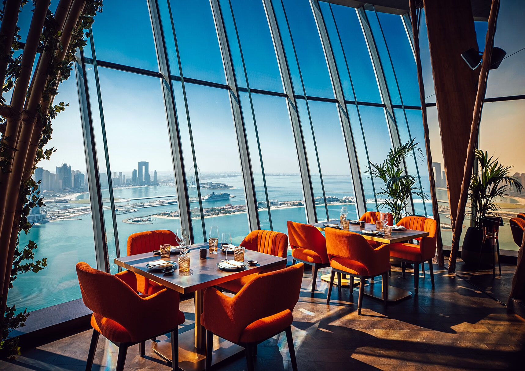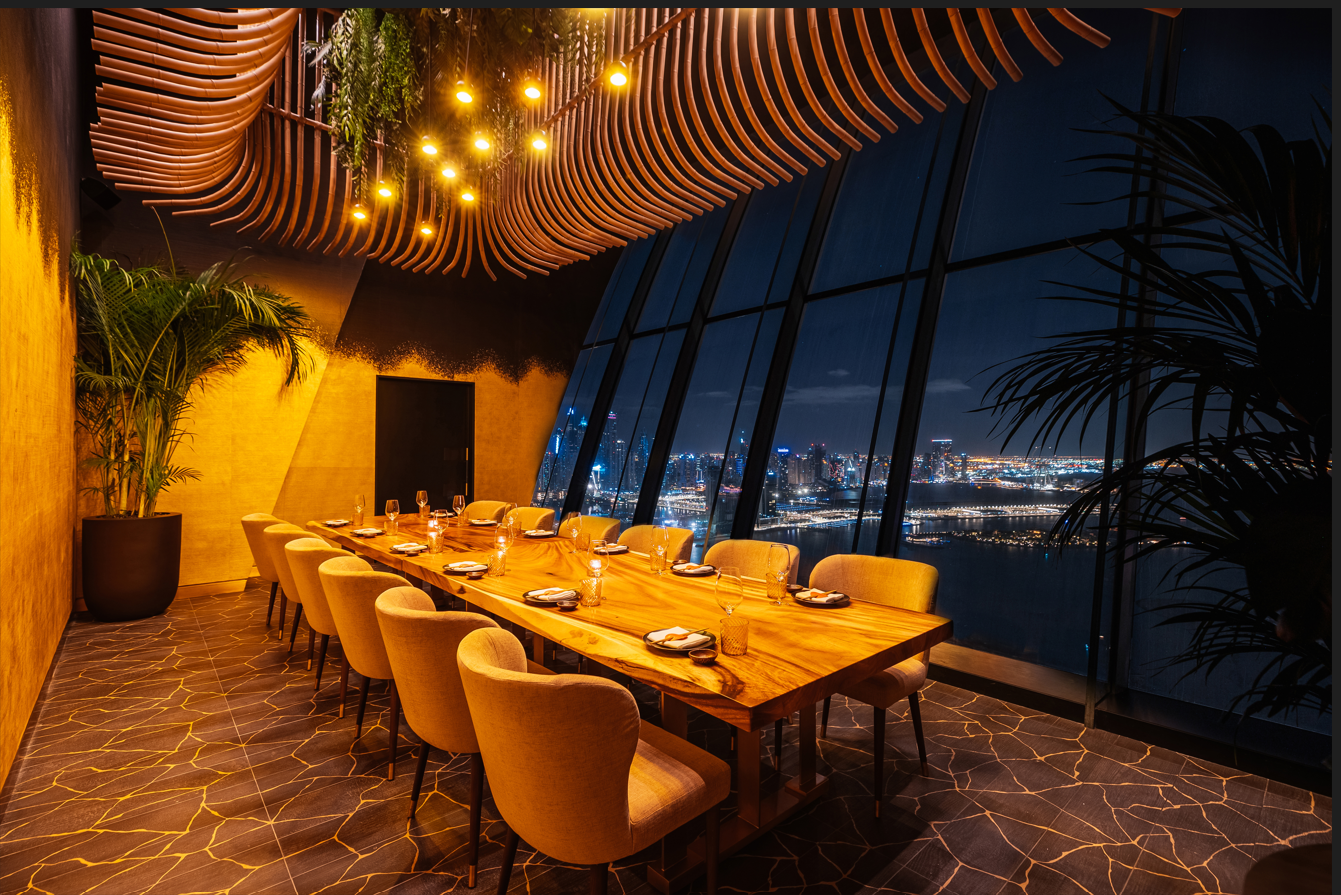 Located on the 51st floor of the St Regis hotel, the restaurant offers unobstructed, 360-degree panoramic views of the iconic Palm Jumeirah coastline, the Arabian Gulf, Ain Dubai, and the Dubai skyline. Two elevators whisk patrons 230 meters up, unveiling a celebrated destination in the clouds; the highest restaurant on Palm Island.