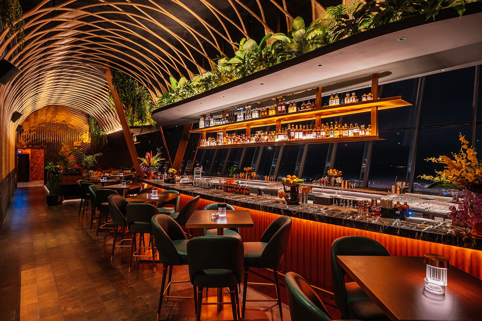 The striking interior is framed by an expansive 3D-printed ceiling installation – intricate woodwork inspired by Japanese and Brazilian weaving traditions. Warm, deliberate lighting illuminates this masterpiece, while taking care to spotlight the cuisine and limit reflections across the immaculate skyline. At the heart of the dining room sits a theatre-style open kitchen showcasing an energetic robata grill and sushi bar.
