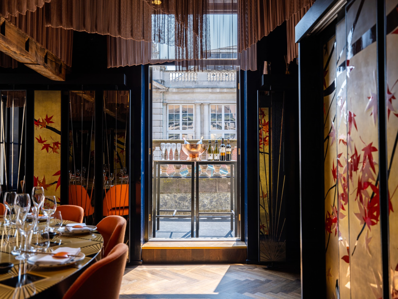sake flights being poured at SUSHISAMBASUSHISAMBA Table set up group diningband at SS Covent Gardendj sushisamba